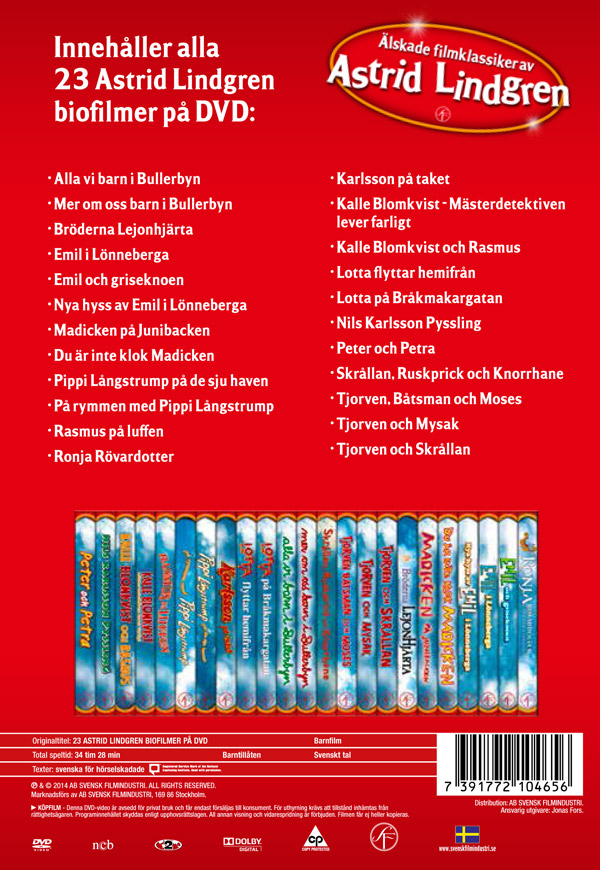 Fakta Boxen innehåller 23 filmer: Alla vi barn i Bullerbyn Mer om oss barn i Bullerbyn Bröderna Lejonhjärta Emil i Lönneberga Emil och griseknoen Nya hyss av Emil i Lönneberga Madicken på Junibacken Du är inte klok Madicken Pippi Långstrump på de sju haven På rymmen med Pippi Långstrump Rasmus på luffen Ronja Rövardotter - Den långa versionen Karlsson på taket Kalle Blomkvist - Mästerdetektiven lever farligt Kalle Blomkvist och Rasmus Lotta flyttar hemifrån Lotta på Bråkmakargatan Nils Karlsson Pyssling Peter och Petra Skrållan, Ruskprick och Knorrhane Tjorven, Båtsman och Moses Tjorven och Mysak Tjorven och Skrållan